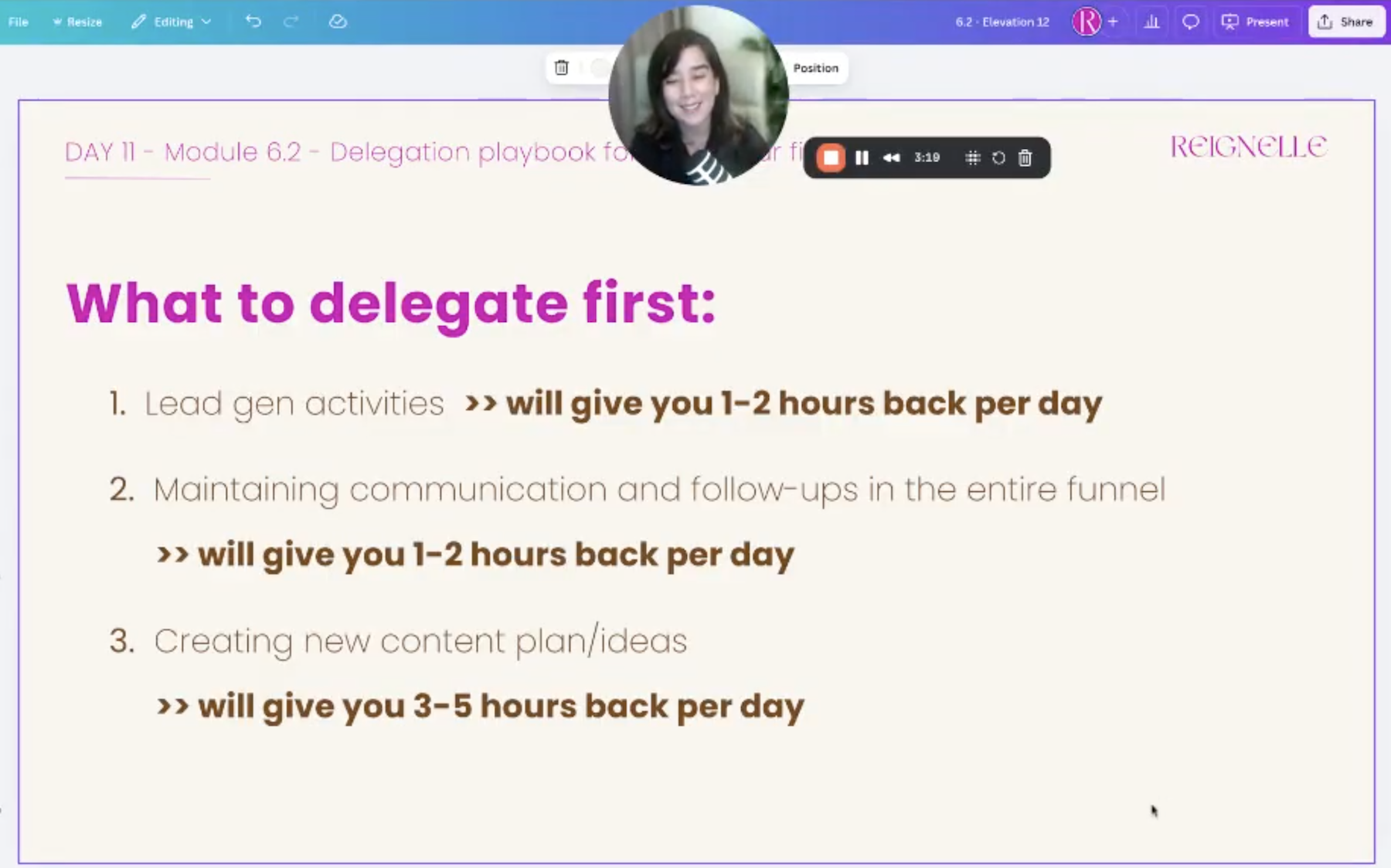 Once your system runs smoothly, you’ll also get our delegation playbook to help you hire your first VA or team member so you can scale your revenue while working fewer hours.