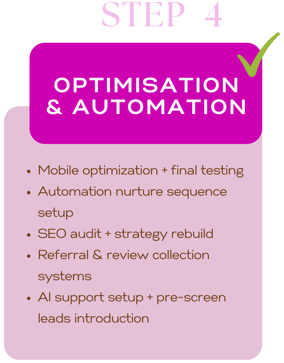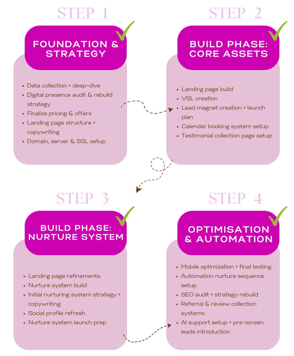 Luvory is our foundational system. Perfect for wellness experts who want to start strong, with lead magnets, strategy, and setup essentials. This package, however, does not include development of follow-up automation, referral, AI and tracking.