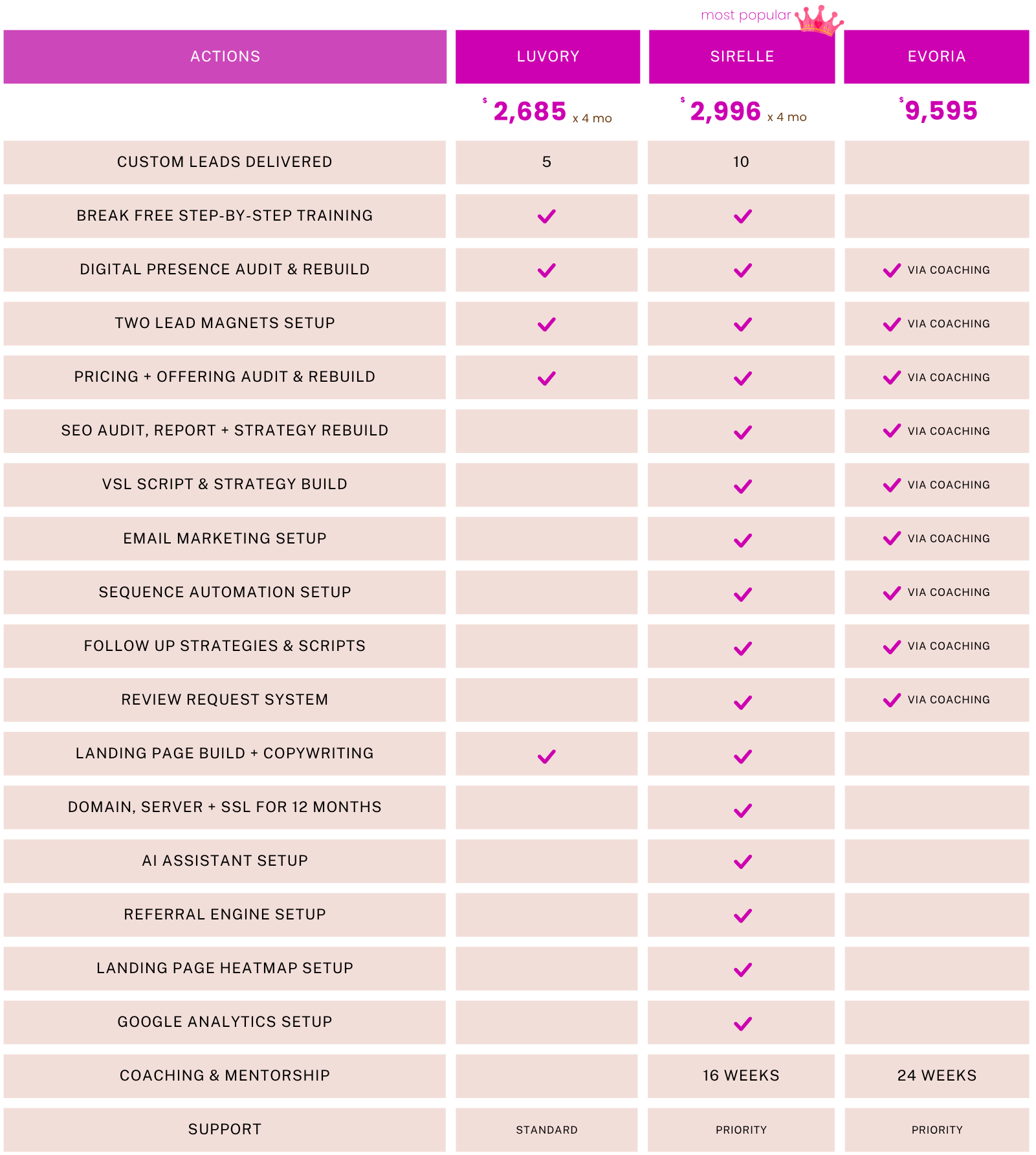 Sirelle (our most popular package) includes everything in Luvory, plus done-for-you follow-up automation so you don’t miss out on converting leads, SEO, review system, tracking and AI-powered tools.