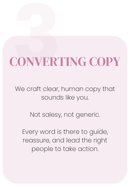 + Conversion-Focused Copywriting : Strategic copy written to clearly communicate your transformation, speak to your ideal client’s pain points, and guide them toward the right next step. You’ll review and approve all copy.